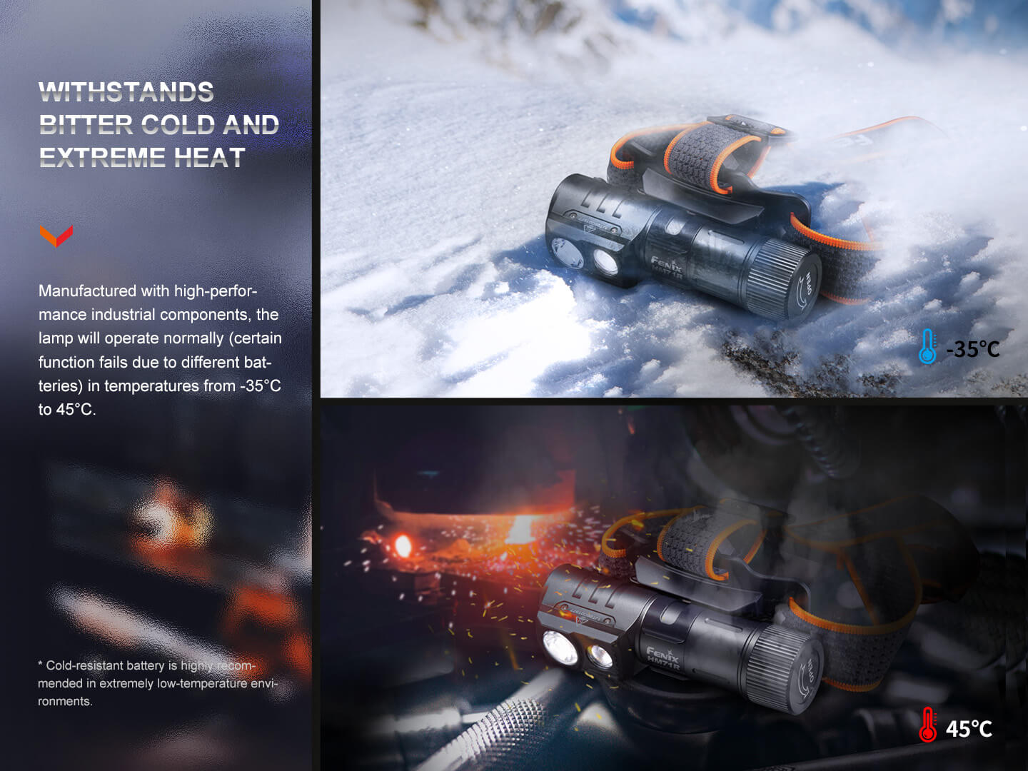 Photos showing the Fenix HM71R rechargeable headlamp in extreme environments