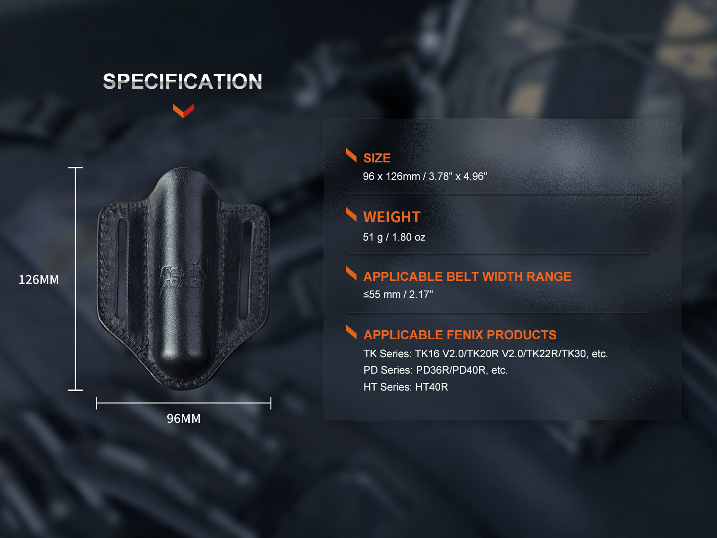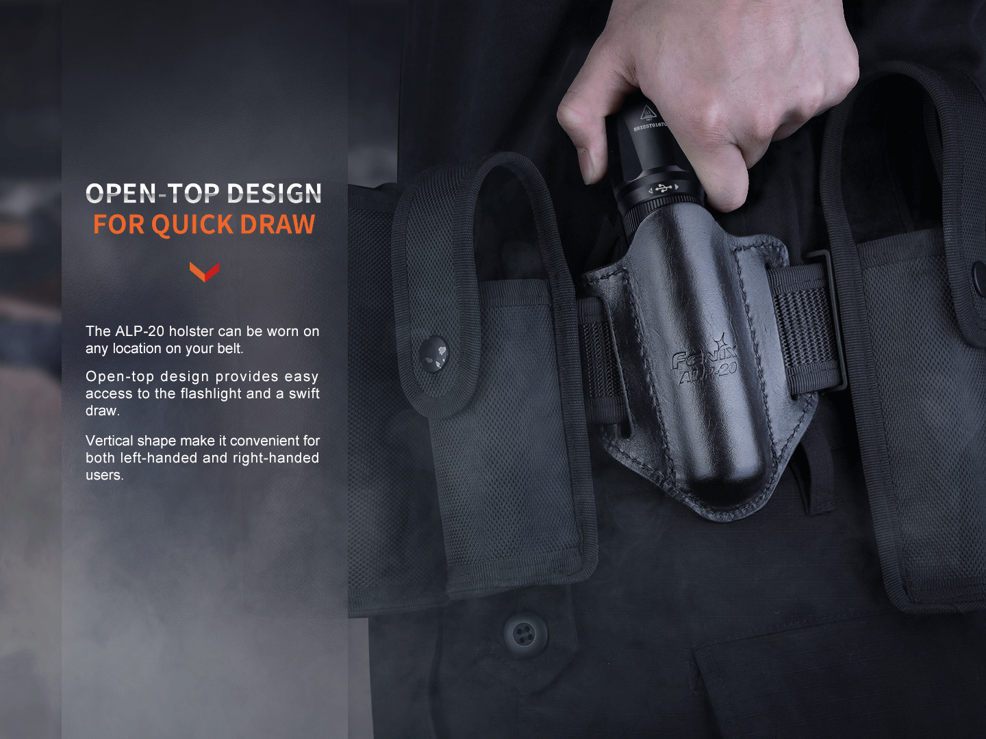 The Fenix ALP-20 open-top flashlight holster offers a secure fit and reliable protection, with its quality full-grain cowhide construction. Perfect for security personnel and law enforcement officers, this holster ensures your flashlight will remain steady even with strenuous physical activity, and it will not be activated accidentally. This holster provides a comfortable, efficient wearing experience to maximize the usefulness of your duty flashlight.