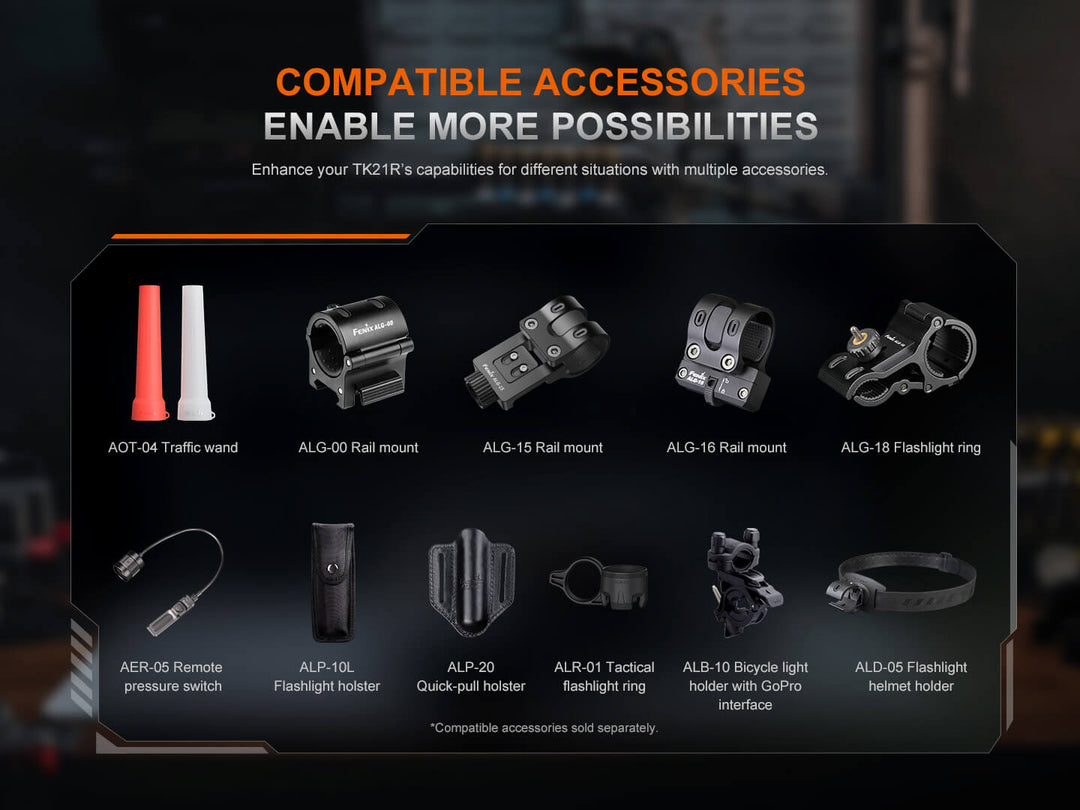 Graphic showing the accessories included with the Fenix TK21R Flashlight