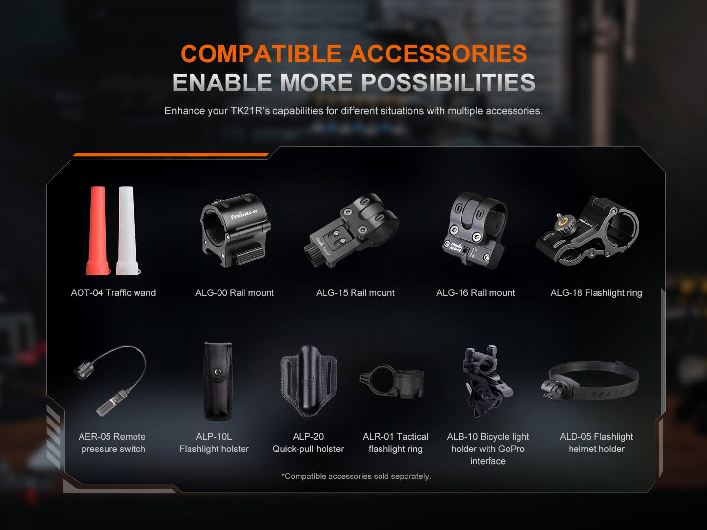 A: AOT-04 Traffic wand, ALG-00 Rail mount, ALG-15 Rail mount, ALG-16 Rail mount, ALG-18 Flashlight ring, AER-05 Remote pressure switch, ALP-10L Flashlight holster, ALP-20 Quick-pull holster, ALR-01 Tactical flashlight ring, ALB-10 Bicycle light holder with GoPro interface, ALD-05 Flashlight helmet holder