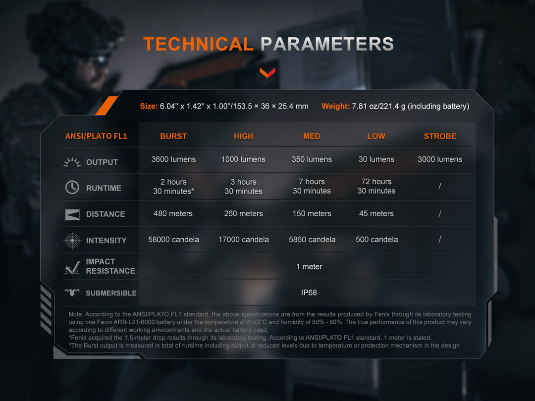 - Take light to the extreme. Traditional forward switches are limited by current, and it is difficult to achieve brightness above 2000 lumens. In the age of 21700 batteries gradually expanding, 3000-lumen tactical flashlights are almost impossible with traditional circuitry, but flashlights using Fenix's APF technology can surpass these limitations!