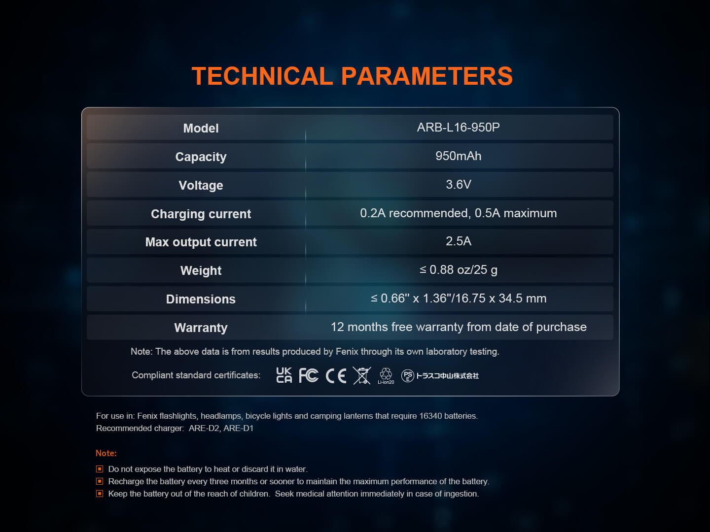 Technical parameters of the Fenix ARB-L16-950P battery on a dark background