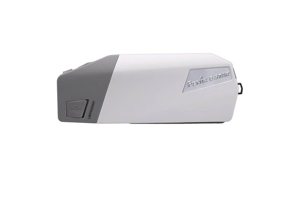 A Fenix E-STAR emergency LED flashlight with a power button and USB Type-C port.